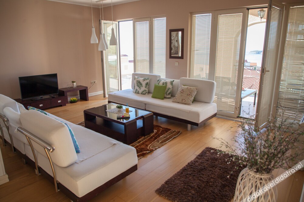 Featuring a furnished terrace with sea view, this air-conditioned apartment has a spacious living room combining kitchen facilities, a dining table, large sofa and flat-screen TV.